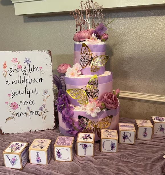 Make their Baby Shower a Fairy Tale with this butterfly garden diaper cake. Not only will you take their breath away with this 3 tiered beauty, you'll also be providing them with something every newborn parent needs - diapers. 60 diapers are included of the highest quality. The cake is also ready to go from the box to the table.