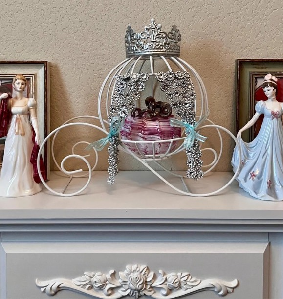 Make their Event a Fairytale with this silver Cinderella carriage holder. Not only will you take their breath away with this one of a kind showpiece, you will be providing them with something that can be used over and over for their future events and also have as a keepsake to remember all of their special occasions.