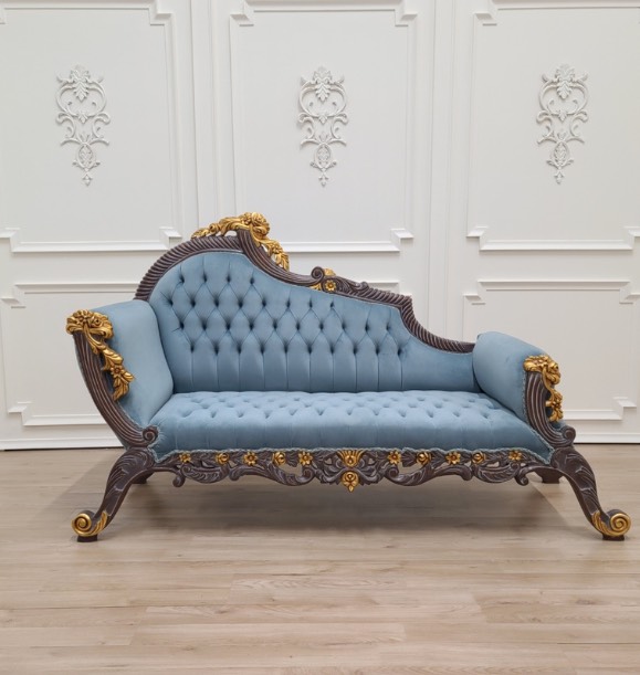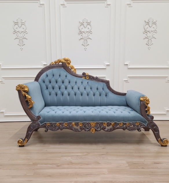 Inspired by the Baroque era and designed to dazzle, this hand-carved, one-of-a-kind french chaise offers striking beauty and incredible comfort. No detail was spared in creating this stunning showpiece. Adorned with lavender velvet, ornate flourishes, and a gold leaf finish; lounging on it will have you feeling like royalty!