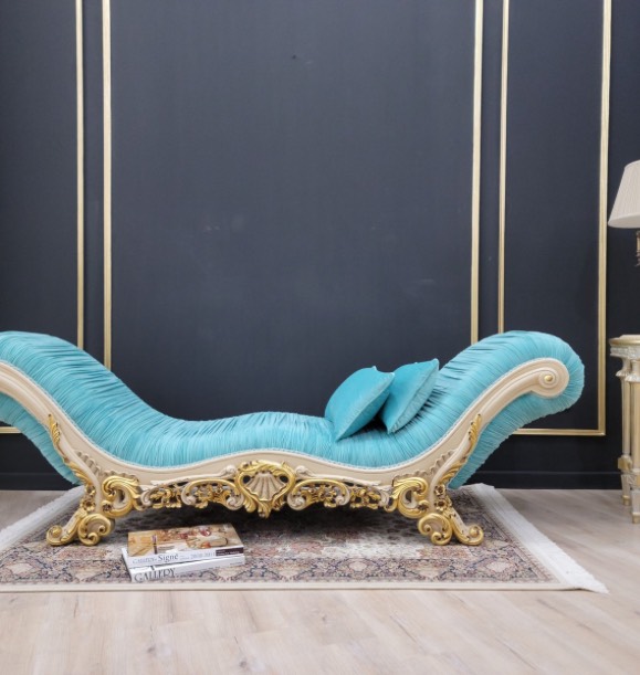 Inspired by the Baroque era and designed to dazzle, this hand-carved, one-of-a-kind french chaise offers striking beauty and incredible comfort. No detail was spared in creating this stunning showpiece. Adorned with turquoise velvet, ornate flourishes, and gold leaf finish; lounging on it will have you feeling like royalty!