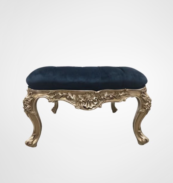 Inspired by the Baroque era and designed to dazzle, this hand-carved, one-of-a-kind french bench offers striking beauty and incredible comfort. No detail was spared in creating this stunning showpiece. Adorned with plush navy velvet, ornate flourishes, and silver leaf finish; lounging on it will have you feeling like royalty!